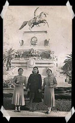 Las recién casadas y recién llegadas de Japón, paseando por la plaza San Martín de la ciudad de Córdoba, Argentina junto a la Sra. Toshiko Higa (centro, de Nago,Okinawa, Japón).