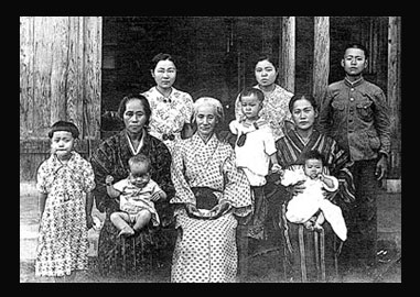 Derecha sentados: Senshun Uema, Nakasone Shizuko, Haruko Nakasone (parada), Haruko Nakasone con su hijo Keizo en brazos, Takako Yonamine, detrás de ella, sentado Kiyotomi Uehara, Chiyoko Uchima, detrás de ella Seizin Uehara, Haruko Tamashiro, Haruko Shokida, Kinmatsu Nakasone.