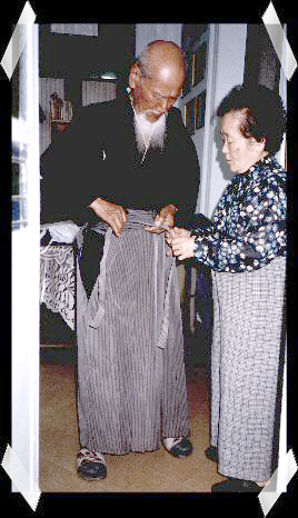 Kiyotomi Uehara probándose el Kimono (Hakama) que le regaló su sobrino Kazumasa Oshiro que se lo mandó desde Okinawa, Japón y su señora Taka le está ayudando a probarselo.