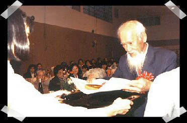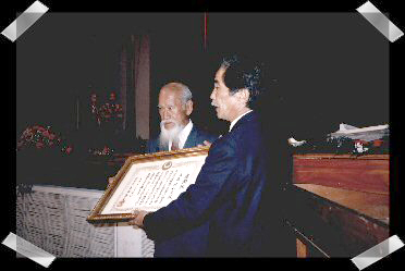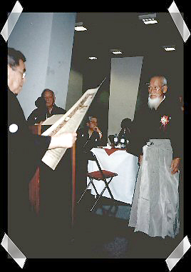 Kiyotomi Uehara (86 años) recibe del presidente del Centro Okinawense (COA) Sr. Yoshiaki Tamaña (de Nishihara, Okinawa, Japón) el diploma de agradecimiento del Gobernador Masahide Ota por el envío de semillas de palo borracho y de Jacaranda.