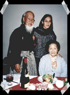Kiyotomi Uehara (88 años) junto con su nieta María Florencia Uehara y su señora Taka Yonamine de Uehara.