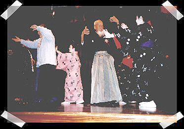 Kiyotomi Uehara bailando el KACHASHI y su hijo Alberto K. Uehara retirándose del escenario después de haberlo bailado junto a su padre.