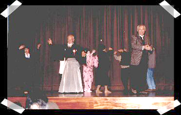 La señora y el Sr. Uehara bailan con las integrantes del cuerpo de danza tradicional con sus kimonos el KACHASHI, danza típica de Okinawa.