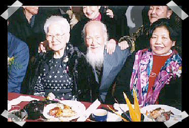 TOKACHI (88 años) de Nabe Shokida, hermana de Kiyotomi Uehara (89 años) celebrado en el Centro Okinawense en la Argentina (COA), atrás de K.U. estan Emilia Uehara (sobrina) y Taka Yonamine de Uehara.