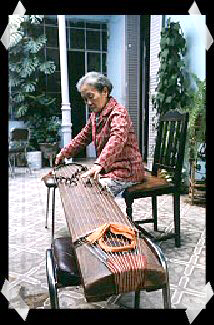 Taka Yonamine de Uehara (72 años) tocando el arpa horizontal (koto), práctica que sólo lo hacía en su casa.