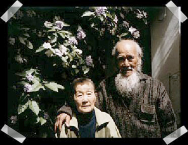 En el patio de su casa Kiyotomi Uehara (91 años) junto con su señora Taka Yonamine de Uehara (87 años).