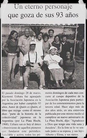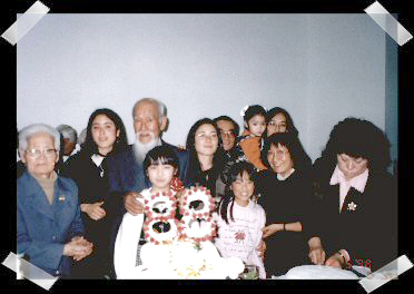 El Sr. Kiyotomi Uehara rodeado por sus nietas María Laura Uehara (izquierda), Marina Miki Uehara (delante), María Cecilia Uehara, Martín Uehara, Elina Eri Uehara en brazos de María Florencia Uehara, Maomi Uehara (bis-nieta de Kiyomasa Uehara), y Elena Uehara.