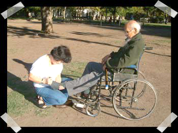 Esta ONG tiene como objetivo “mejorar la calidad de vida de los miembros de la colectividad que más lo necesitan” y una de las actividades que tienen es recorrer las casas particulares e instituciones donde están los ancianos de la colectividad, como con Kiyotomi Uehara, cuya salud se resintió y fue llevado al Parque Centenario que esta cerca de su casa, para hacerlo caminar un poco.