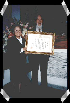 Mostrando el diploma otorgado por el Gobernador de Okinawa Dr. Masahide Ota, Kiyotomi Uehara (86 años) y su señora Takako Yonakine de Uehara.